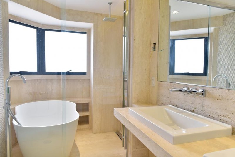 Uma suíte principal tem ofurô de CORIAN, torneira bico de ganso, e mármore Travertino romano